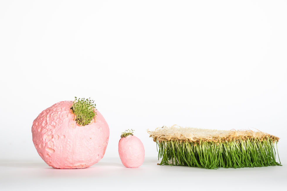 I work with home-grown materials such as chia and wheatgrass, cultivating them on patterned templates to explore themes of impermanence and sustainability. This experimental, low-impact process results in delicate, biodegradable pieces—for example, latex pods embedded with chia, or a patchwork made entirely from wheatgrass roots, which naturally interlace to bind the individual elements together.